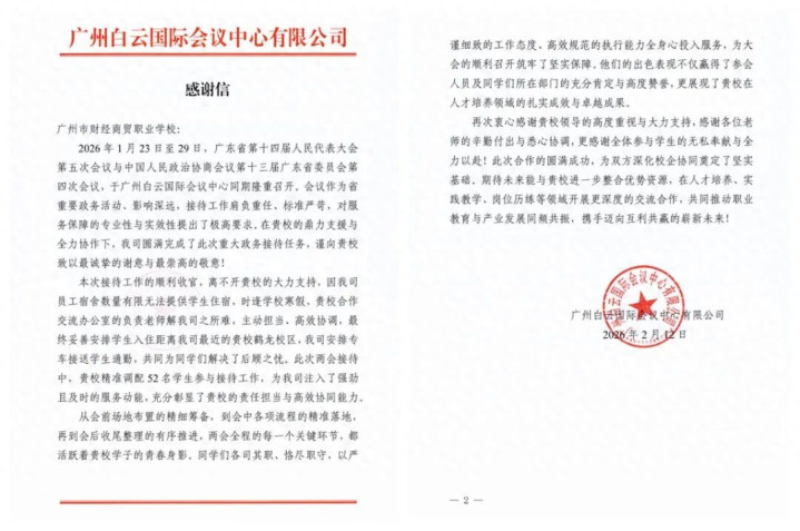 近日,白云国外会议中心向广州市财做贸易贸业绩学校发来感谢信,对学校在广东省第十四届东说念主民代表大会第五次会议及中国东说念主民政事协商会议第十三届广东省委员会第四次会议技术的大力撑握与密切合作默示由衷感谢,并对广州市财做贸易贸业绩学校学子在政务理睬责任中的出色发达赐与高度评价。