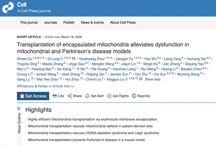 Du S, Long Q, Zhou Y, Fu J, Wu H, Yang L, Xie Y, Ding Y, Zhang M, Guo J, Wang M, Lin J, Hu M, Zhang J, Yao D, Li W, Bao F, Xiang G, Wu Y, Huang Y, Liang H, Wang R, Li H, Chen B江南app体育官网下载, Li C, Wang J, Zhang J, Qin D, Sun J, Zhu Y, Sun F, Wang W, Lu G, Chan WY, Zhao H, Liu C, Liu X. Transplantation of encapsulated mitochondria alleviates dysfunction in mitochondrial and Parkinson's disease models. Cell. 2026 Mar 18:S0092-8674(26)00230-8. doi: 10.1016/j.cell.2026.02.023. Epub ahead of print. PMID: 41856111.