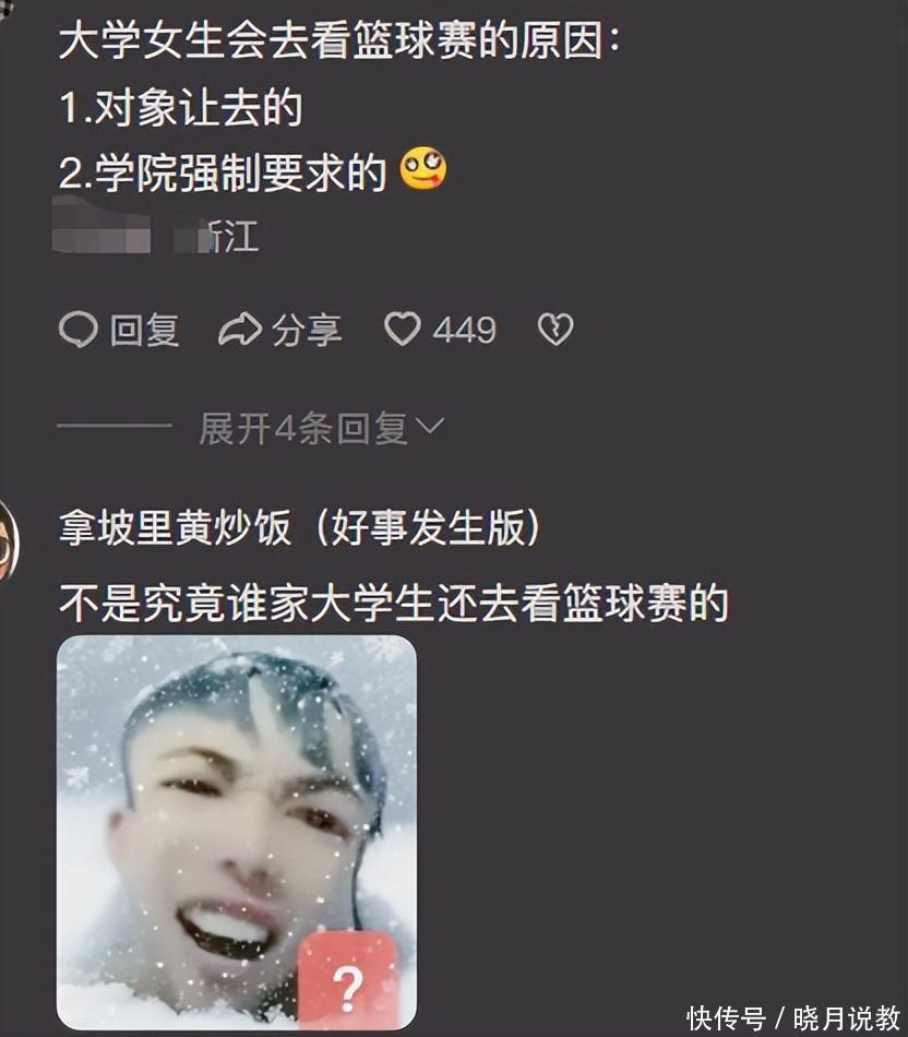 但施行呢?10个女大学生中,起码有9个都不会主动去看篮球赛,许多女生干预篮球赛的原因无非唯有两个,一个是对象让我方去看,另一个便是学院强制条款出些许个不雅众,才不得不去。