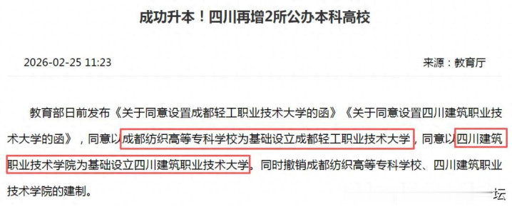 本年2月份,熟悉部厚爱官宣四川两所专科院校顺利升格本科,分离是原成齐纺织高级专科学校、原四川建筑行状技能学院,现已改名为成齐轻工行状技能大学和四川建筑行状技能大学。