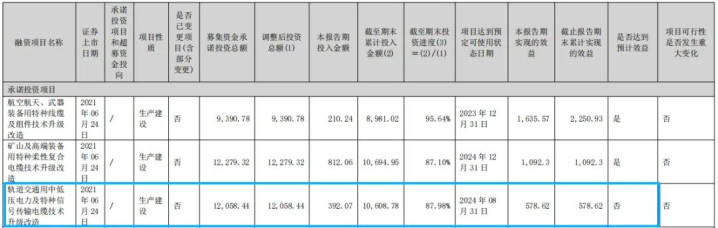 年报裸露了公司2021岁首度公开垦行募投名方针发扬。其中,“轨谈交通用中低压电力及特种信号传输电缆期间升级矫正”名目不仅履历了延期,且在陈诉期内实现效益578.62万元,未达到预期。