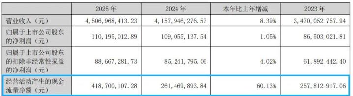 但年报中信得过的亮点,是筹办行径产生的现款流量净额。这一数字从2024年的2.61亿元飙升至2025年的4.19亿元,同比大增60.13%。公司证据为“营销范围扩大,加速订单快产快销快结算,优化采购资金结算神色及账期”。