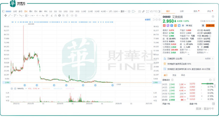 值得一提的是,艾好意思疫苗依然于2022年10月登陆港交所主板,其股价一度涨至100港元,但尔后碰到权贵下落,终端3月31日收盘依然缩水至2.95港元,市值也跌至了36.18亿港元,推崇相当惨淡。