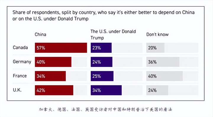 英好意思两家机构和洽搞了一场大范围民意访问,采访了一万多名西方国度的成年东谈主,效果径直给了华盛顿一记响亮的耳光。在加拿大,卓绝一半的老匹夫认为,中国媲好意思国更可靠。在德国、法国、英国这三个好意思国的传统铁哥们家里,认为中国靠谱的东谈主,也比认为好意思国靠谱的东谈主多。