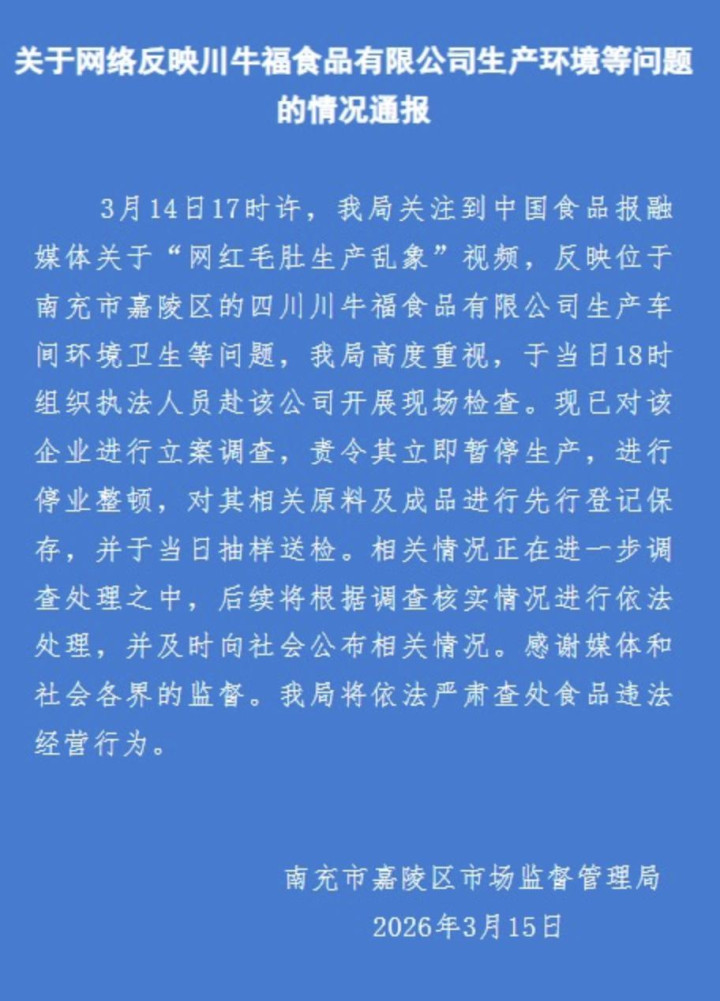 3月15日,四川南充市嘉陵区商场监督处置局发布情况通报称,3月14日18时,该局组织王法东说念主员赴涉事毛肚居品加工企业四川川牛福食物有限公司开展现场检查。现已对该企业进行立案造访,责令其立即暂停坐褥,进行破产整顿,对其联系原料及制品进行先行登记保存,并于当日抽样送检。联系情况正在进一步造访处理之中。